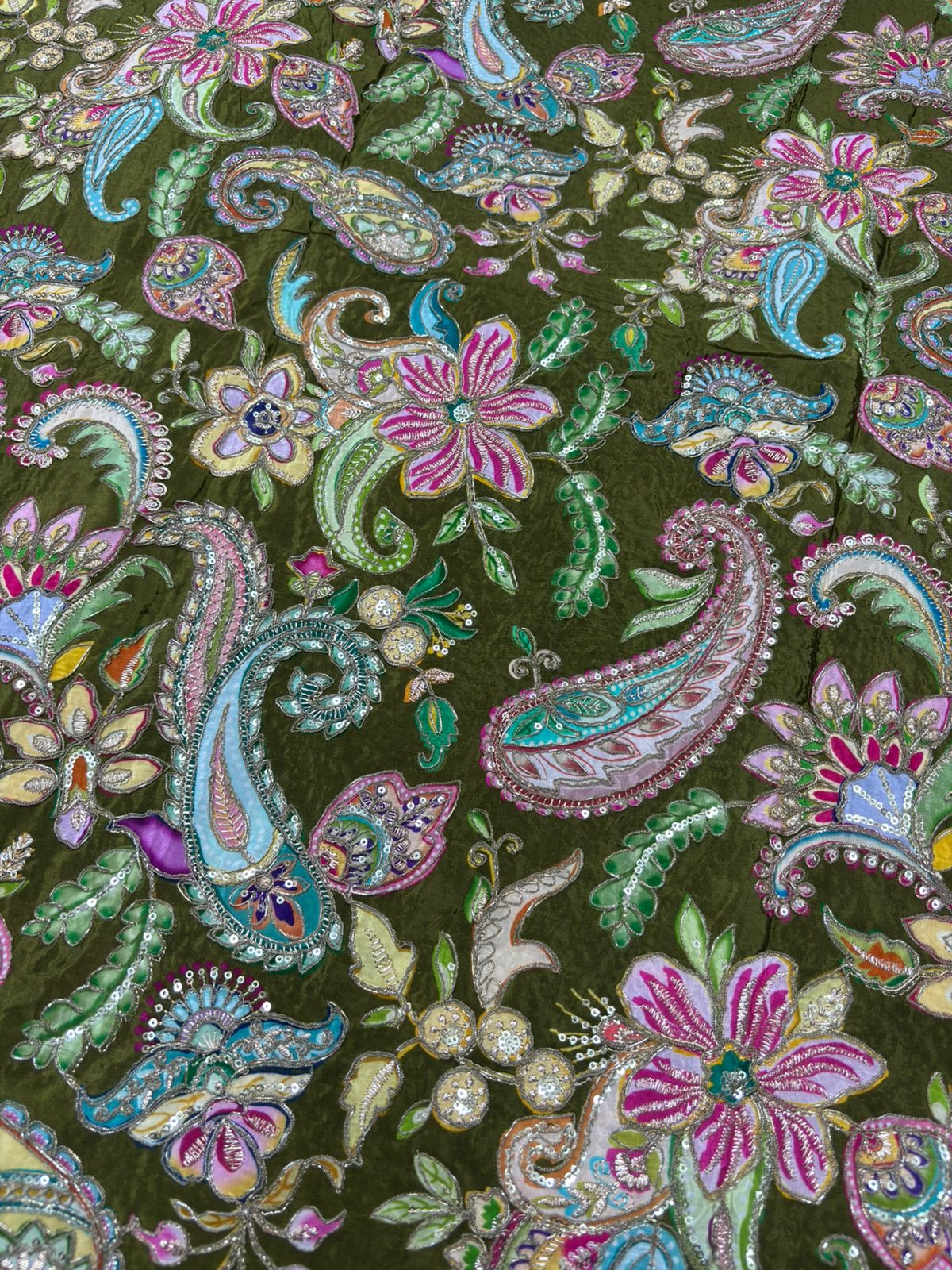 Crafted from premium-quality pure crepe, the fabric features artistic position prints that add sophistication and uniqueness to every outfit. Its lightweight yet rich texture ensures comfort, while the glossy finish enhances the beauty of intricate embroidery and embellishments.