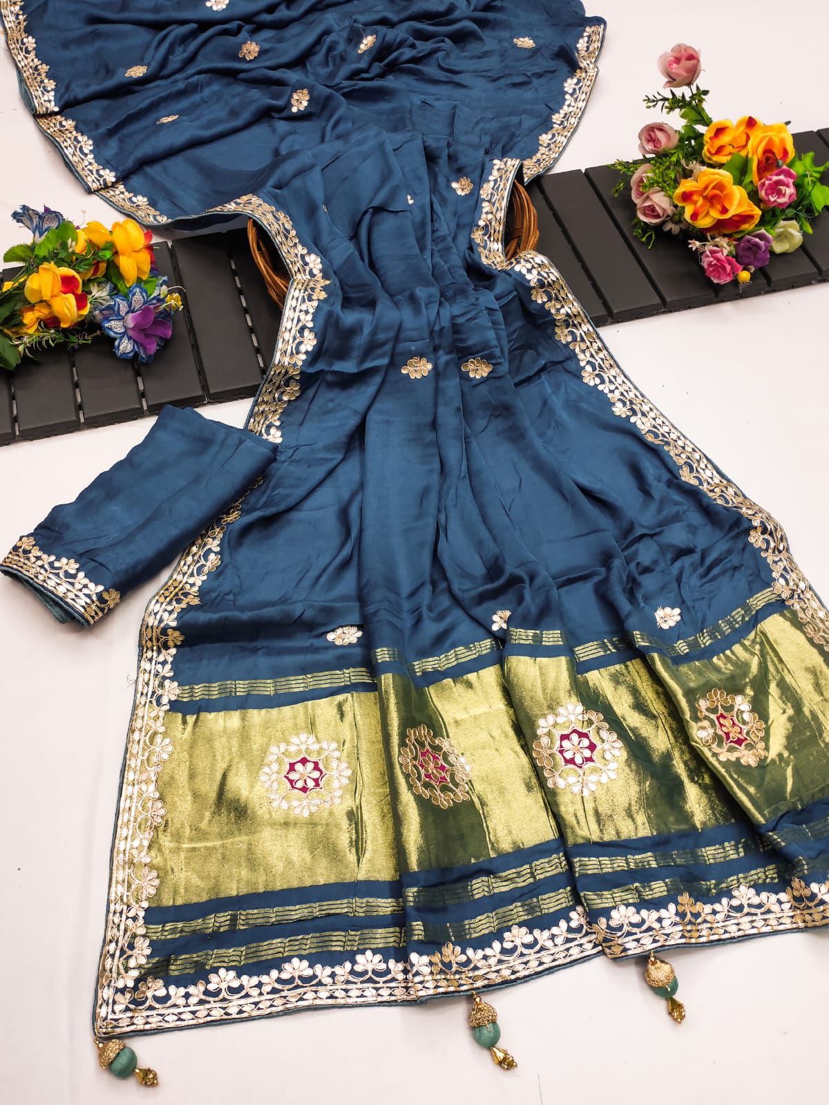 Timeless SophisticationStep into regal charm with our Royal Purple Gajji Silk Saree. This saree is a masterpiece, combining luxurious fabric with detailed artisanal embroidery. Gajji silk is known for its silky-smooth texture, soft drape, and subtle sheen, making this piece perfect for any grand occasion.Intricate Embroidery DetailsThe saree is adorned with delicate floral buttas scattered across the body. It features a rich, heavily embroidered border. The detailed work uses traditional Zari and Resham threads, accented with mirror-style details for extra grandeur. This reflects true artistry in every single weave.The Majestic Golden PalluThe true highlight of this saree is its majestic Golden Pallu. It is finished with intricate floral motifs, mirror work, and elegant tassels that bring movement and grace. The contrast between the royal purple and the golden pallu makes this saree a stunning showstopper for weddings and festive gatherings.Key Features & OccasionsThe saree is paired with a matching running blouse piece (in the same fabric), giving you the freedom to customize your perfect look.FeatureDetailFabricPremium Gajji Silk (smooth, lustrous drape)ColorRoyal Purple with contrasting Golden PalluWorkElegant Embroidery with Zari, Resham, and Mirror accentsIncludesMatching Running Blouse PieceBest ForWeddings, Receptions, Diwali, Navratri, and Cultural events . Embrace the grandeur of tradition with this Gajji Silk Saree, where royal colors meet timeless embroidery craftsmanship.