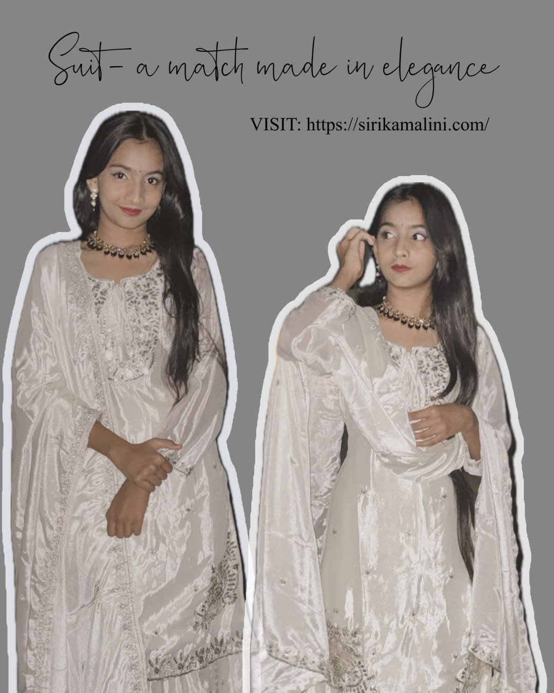This is a beautiful White Chinon Suit offered as an Indo-Arabic Style 3-Piece Set. Crafted from flowing Chinon fabric, this dress is guaranteed to make your special day memorable.