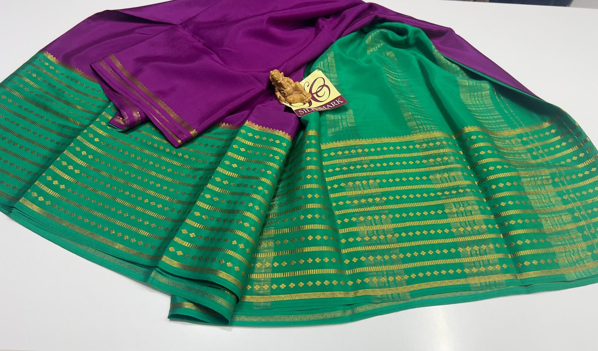 Timeless Elegance and ComfortExperience timeless elegance with our pure Mysore crepe silk saree. This is a masterpiece of traditional craftsmanship and luxurious comfort, woven from $100\%$ pure silk. The saree features the signature soft texture and graceful fall of authentic Mysore crepe. Its lightweight feel makes it perfect for all-day wear.Royal Heritage and DesignEach saree reflects royal Mysore heritage with a subtle sheen and smooth drape that enhances your silhouette. This piece is handwoven by skilled artisans from Mysore and boasts a rich texture and luxurious drape.Design: Features a unique blend of classic stripes and checks, offering a perfect balance of traditional charm and modern sophistication.Ideal for: Festive occasions, weddings, parties, or sophisticated everyday elegance.Styling: Pair it with gold or silver jewelry for a refined traditional look, or style it minimally for a modern twist.Key FeaturesFabric: $100\%$ Pure Mysore Crepe SilkFeel: Lightweight & breathable, with soft texture and natural sheenDrape: Elegant and easy to styleSuitable for: Festive, party, or formal occasionsAvailability: Available in multiple colorsCare InstructionsDry clean only.Store in a muslin cloth or cover to maintain silk quality and sheen.Note: Slight color changes may occur due to camera settings/lighting effects. Exchange and return based on color perception are not accepted.